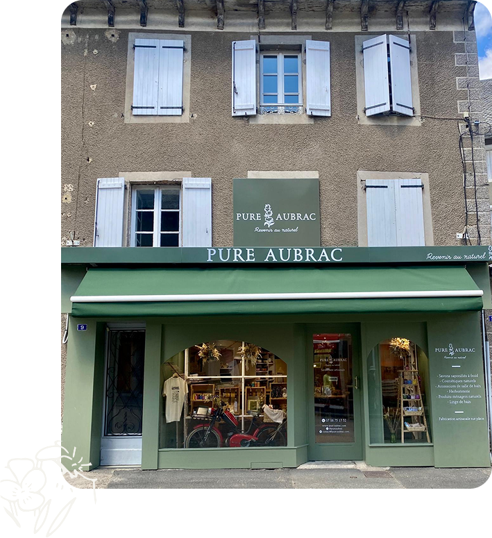 Pure Aubrac, c’est avant tout une envie : proposer des produits sains, naturels, efficaces et respectueux du corps, de la planète, et du rythme de chacun. Depuis nos débuts, nous fabriquons nos savons et cosmétiques avec patience et exigence, dans une démarche artisanale qui privilégie la qualité, la transparence et le bon sens. Aujourd’hui, nous sommes fiers de vous accueillir dans notre toute première boutique physique, installée au cœur du village de Laguiole. Une adresse chaleureuse et authentique, à notre image, où vous pouvez venir découvrir, sentir, toucher et poser vos questions. Une vraie boutique, à taille humaine, pour prendre le temps de bien choisir.